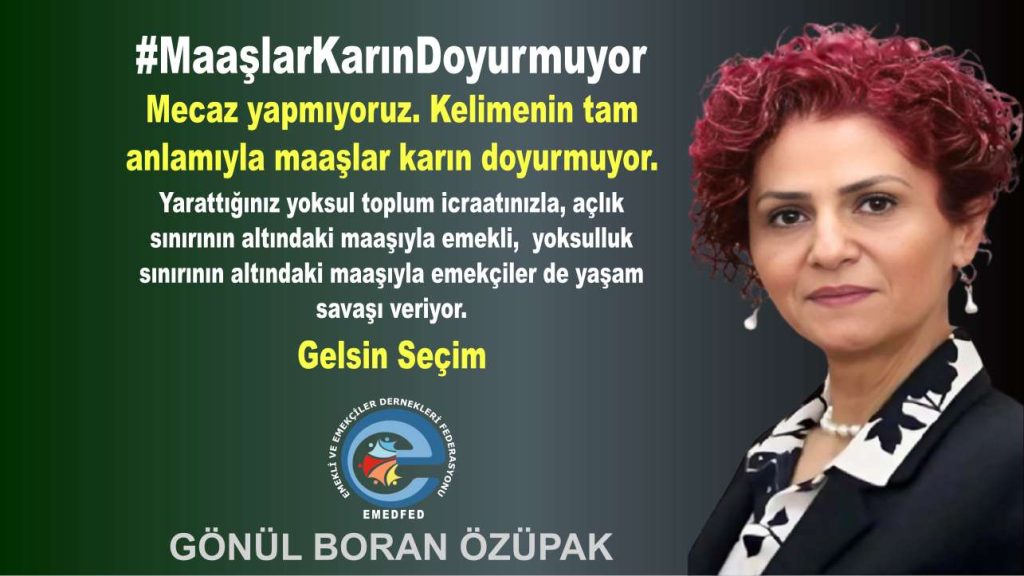 Emekli ve Emekçiler Dernekleri Federasyonu (EMEDFED) Başkanı Gönül Boran Özüpak, sosyal medya platformu X hesabından yaptığı #MaaşlarKarınDoyurmuyor paylaşım ile emeklilerin ve çalışanların geçim sıkıntısına vurgu yaptı. Özüpak’ın […]