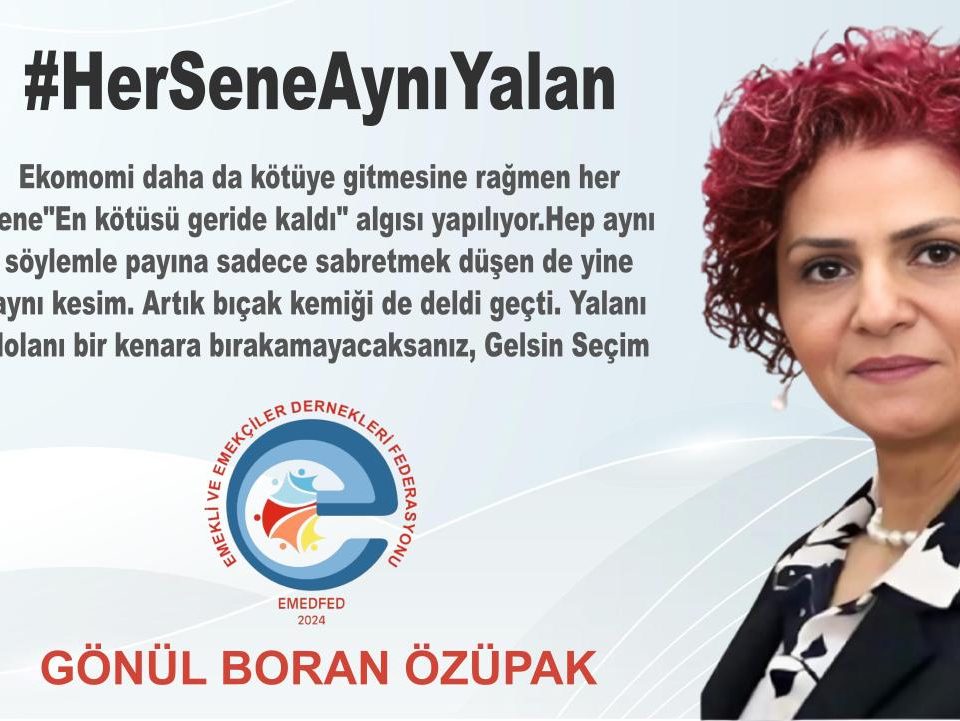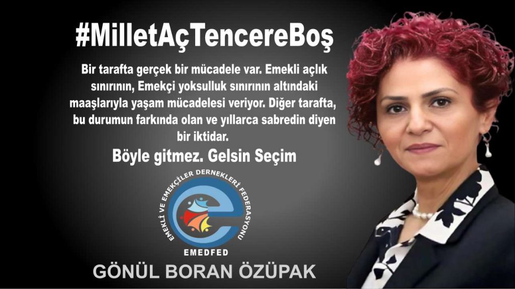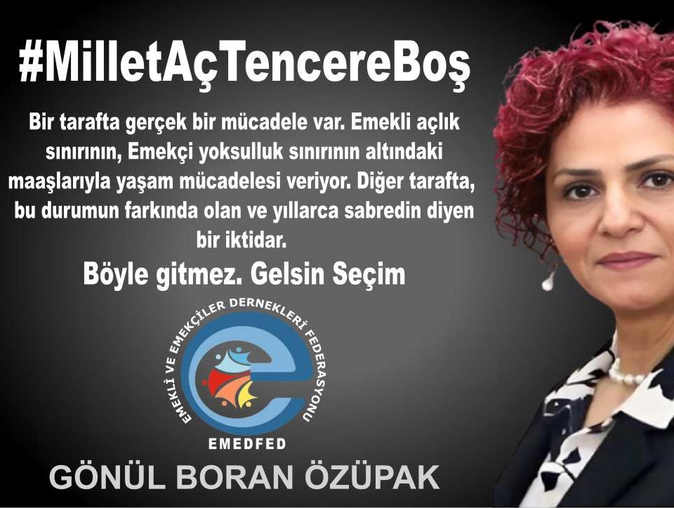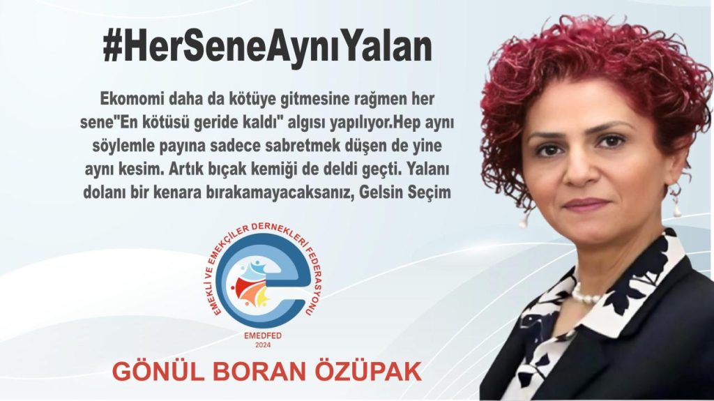 Emekli ve Emekçiler Dernekleri Federasyonu (EMEDFED) Başkanı Gönül Boran Özüpak, sosyal medya platformu X hesabından yaptığı #MaaşlarKarınDoyurmuyor paylaşım ile emeklilerin ve çalışanların geçim sıkıntısına vurgu yaptı. Özüpak’ın paylaşımı şöyle: